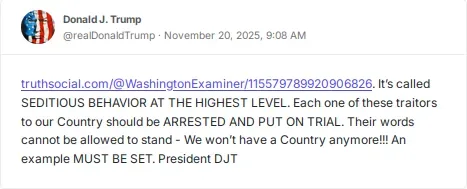 Trump, Donald. “Seditious.” 11/20/2025. https://trumpstruth.org/statuses/33910 – Accessed 1/12/2026.