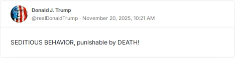 Trump, Donald. “Punishable by Death.” 11/20/2025. https://trumpstruth.org/statuses/33937 – Accessed 1/12/2026.